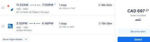 Google Flights: Edmonton to Tokyo and then Sapporo to Edmonton